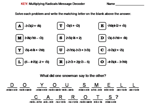 Multiplying Radicals Worksheet (pdf) and Answer Key. Free , 25 ... Objective Students will practice multiplying square roots (ie radicals). This worksheet has model problems worked out, step by step as well as 25 scaffolded questions that start out relatively easy and end with some real challenges. Example Questions Directions: Mulitply the radicals below. (Express your answer in simplest radical form)